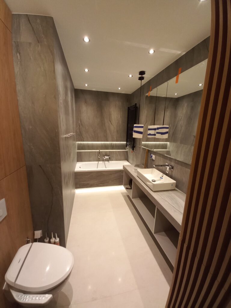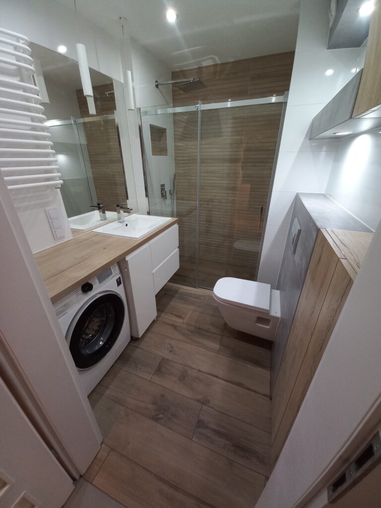 Dla porównania remont istniejącej już łazienki ze skuwaniem starych płytek, wykonaniem nowych tynków i posadzek, przeróbkami, zabudowami może zająć od 12 do 16 dni roboczych.