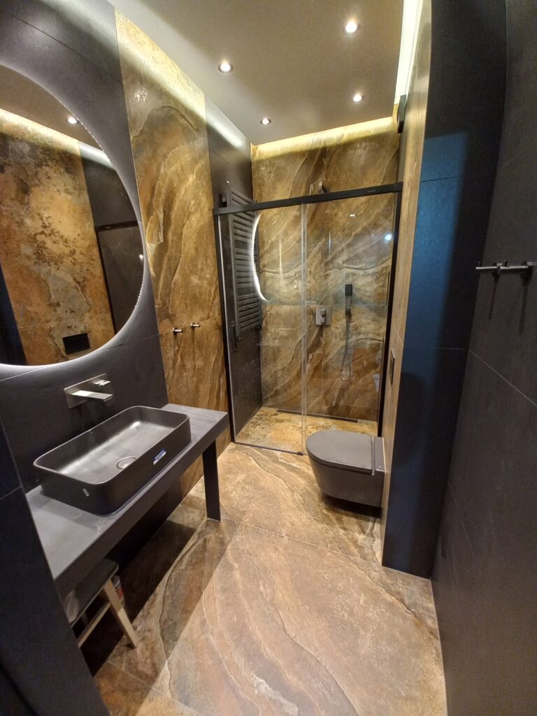 Czas pracy jest zależny w głównej mierze od tego ,jak złożone i skomplikowane jest zlecenie. Przykładowo wykonanie standardowej łazienki w stanie deweloperskim, bez konieczności robienia przeróbek wodno-kanalizacyjnych czy elektrycznych, jak również zabudowy, półek, wnęk, zakładając ze tynki i wylewki są proste zajmie około 4-5 dni roboczych.
